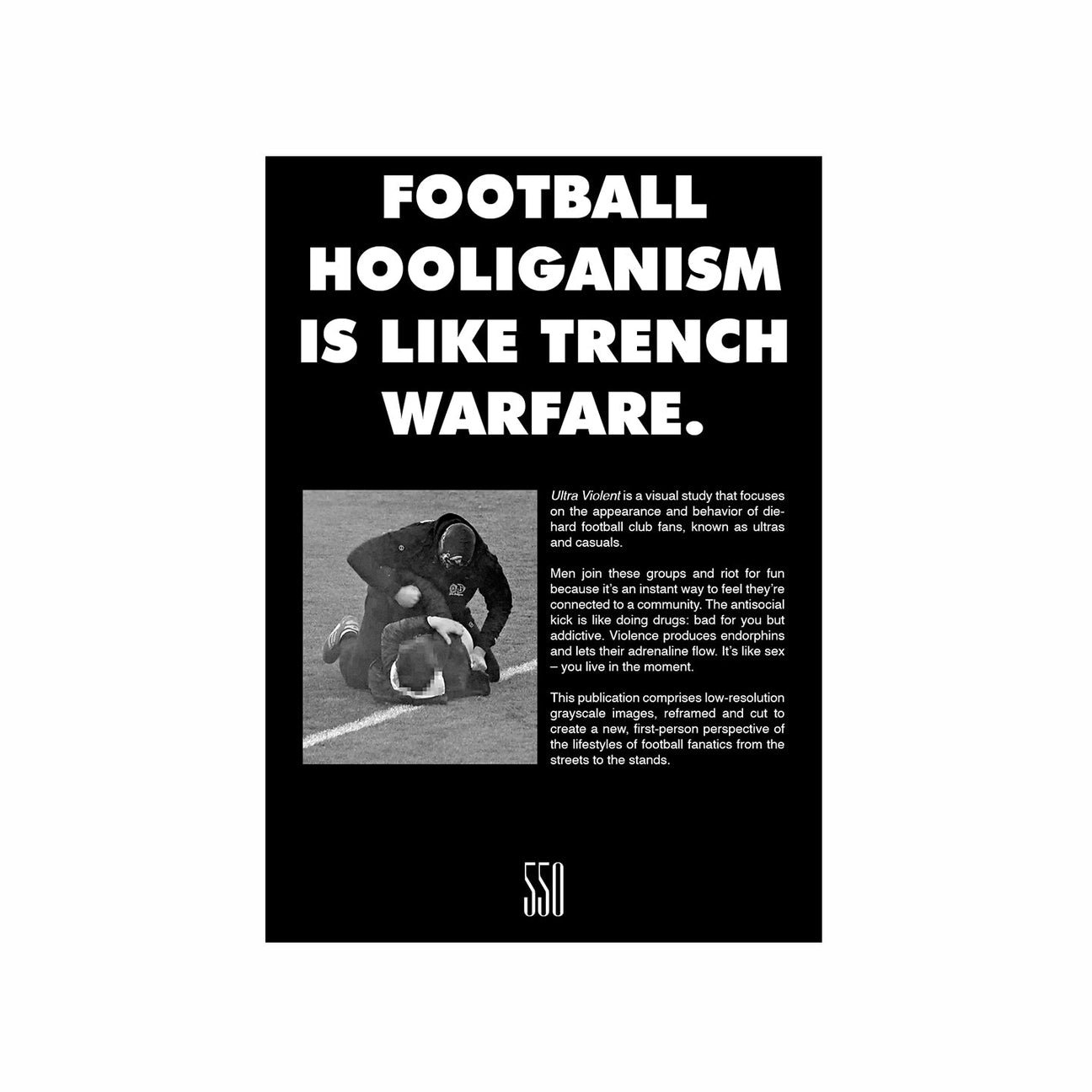 This publication comprises low-resolution grayscale images, reframed and cut to create a new, first-person perspective of the lifestyles of football fanatics from the streets to the stands.