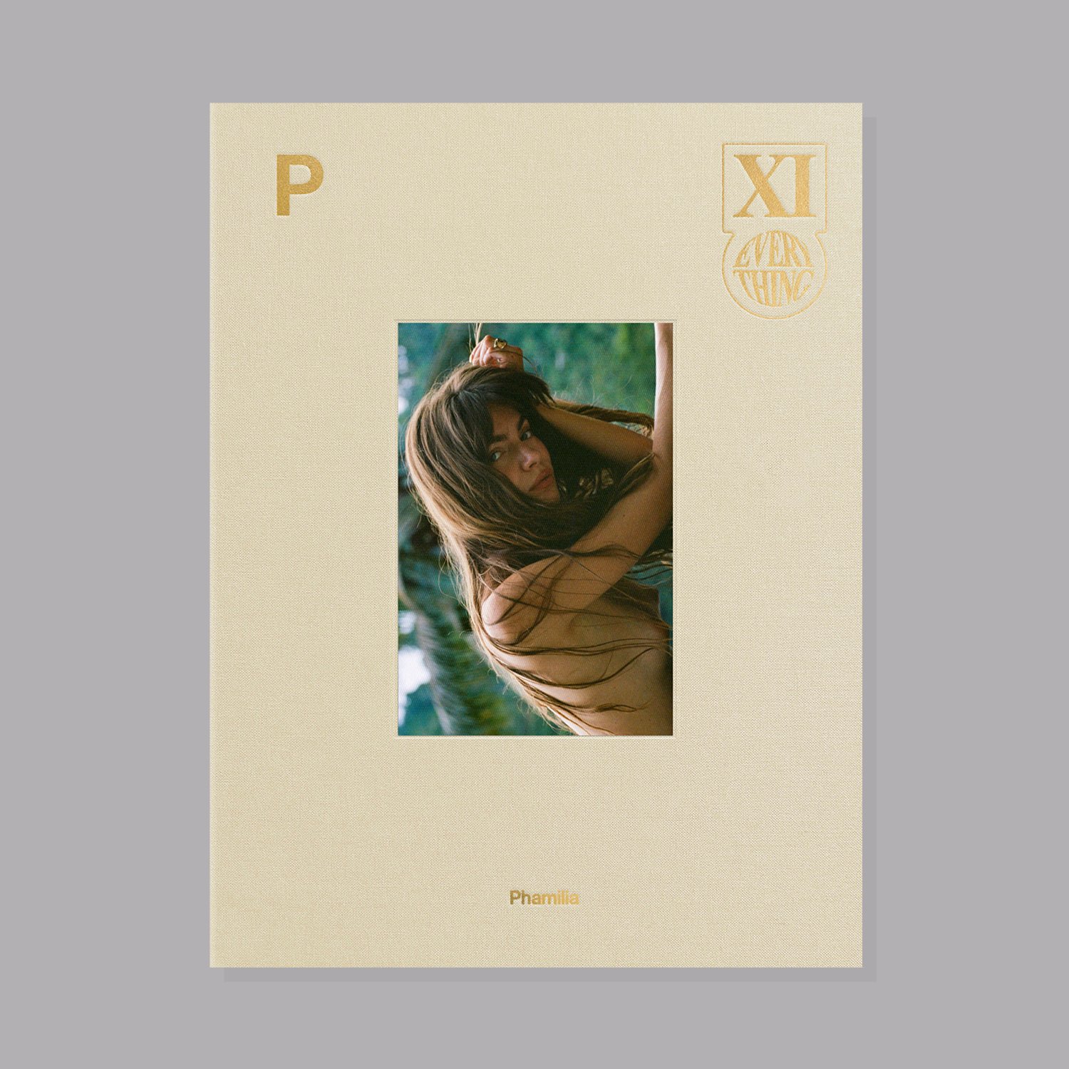 → P Nº11 book with yellow exposed spine binding with gold foil details.