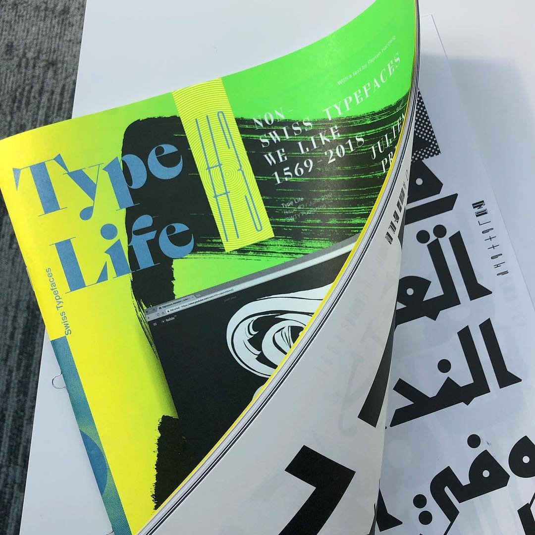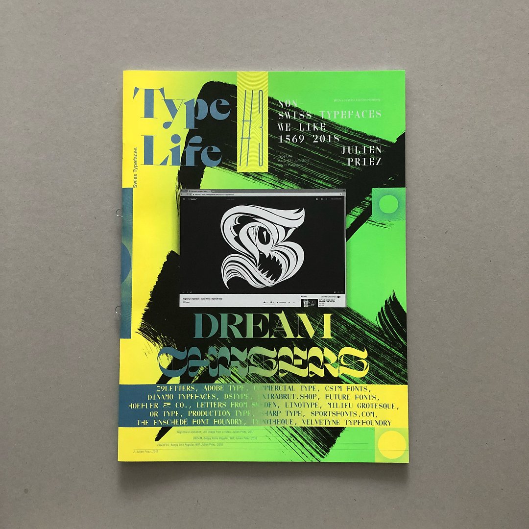 In the third issue of Type Life, Swiss Typefaces take a look beyond their own work and celebrate contemporary type made by others. The Swiss design studio compiled a selection of their favorite typefaces, licensed the fonts and used them to design a magazine. The resulting specimen of “Non-Swiss Typefaces We Like 1569–2018” comes with a text by Florian Hardwig (Fonts In Use) and is visually enriched with works by lettering artist Julien Priez (boogypaper).